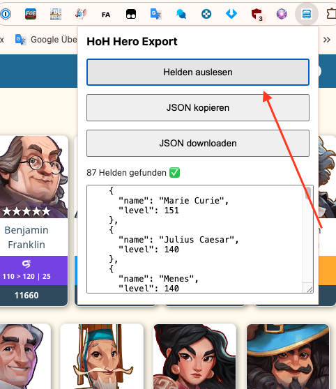 - Wichtig: Alle Helden müssen angezeigt werden. Dann auf Helden auslesen klicken und JSON kopieren.