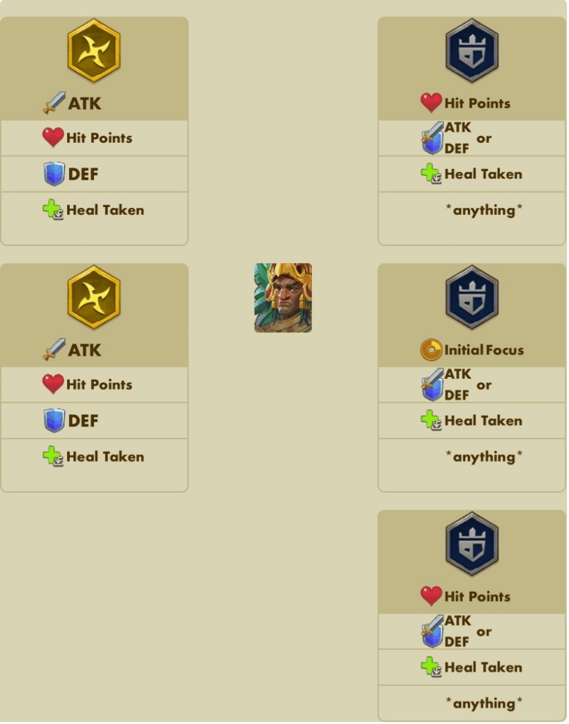 Hier wird primär defensive Stats empfohlen, dabei ist der Held ja offensichtlich primär eher auf Angriff aus.„Eine defensive Ausrichtung wie hier empfohlen ist zwar möglich, offensive Ausrichtung passt jedoch weit besser zur Stärke des Helden“